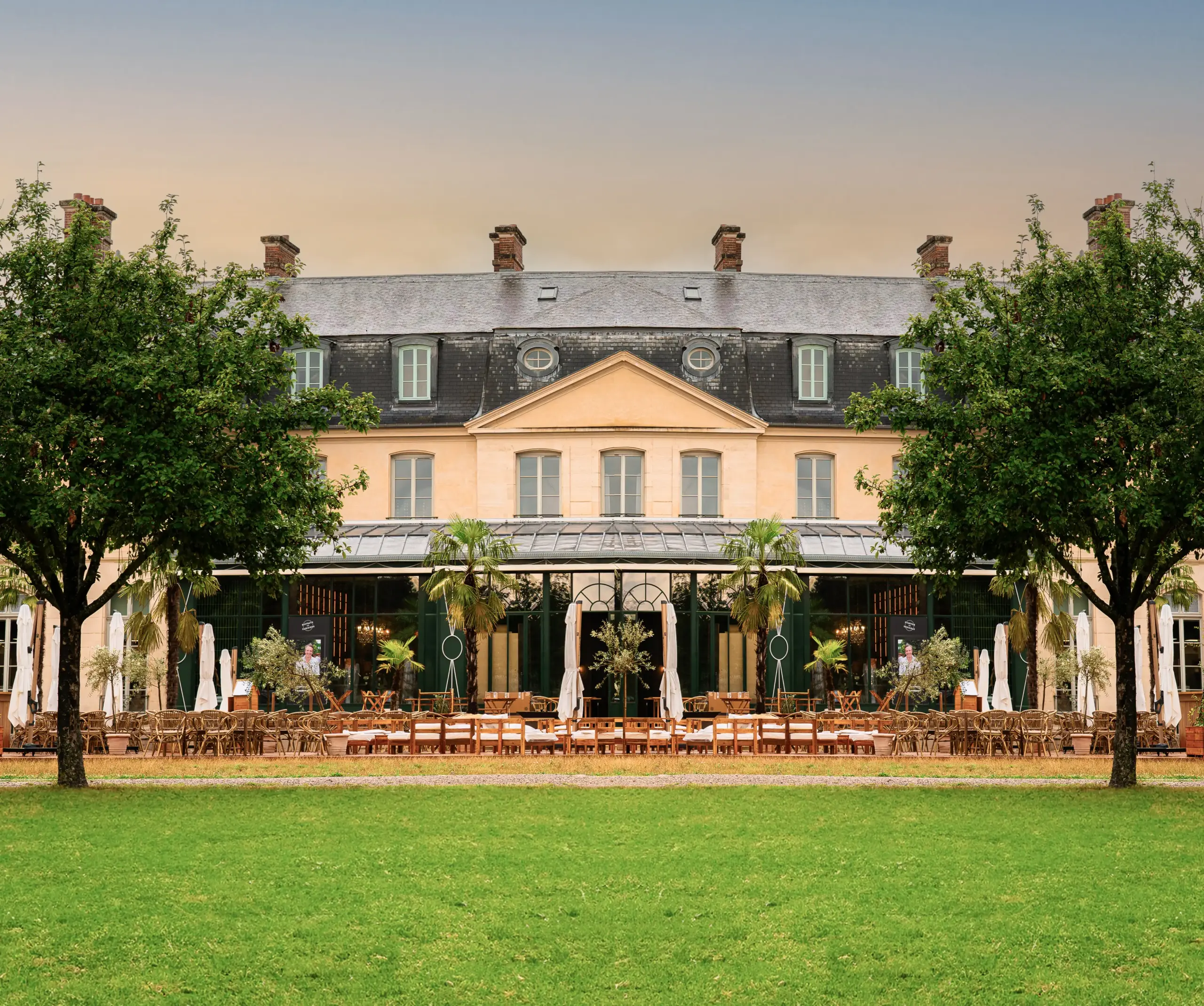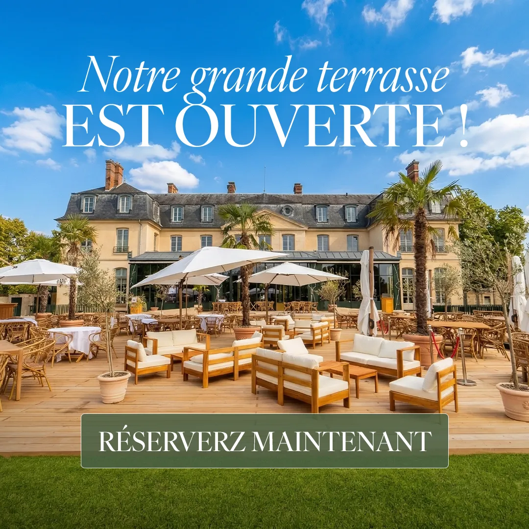 À quelques minutes de Paris, le Château de Croissy abrite un parc préservé, vaste et silencieux, où l’on prend le temps de s’installer. La terrasse de Chou s’ouvre sur les pelouses et les allées bordées d’arbres centenaires, entre lumière douce et calme retrouvé. À l’heure du déjeuner comme du dîner, on s’y sent bien, loin de l’agitation, entouré d’un décor naturel et historique unique en son genre.